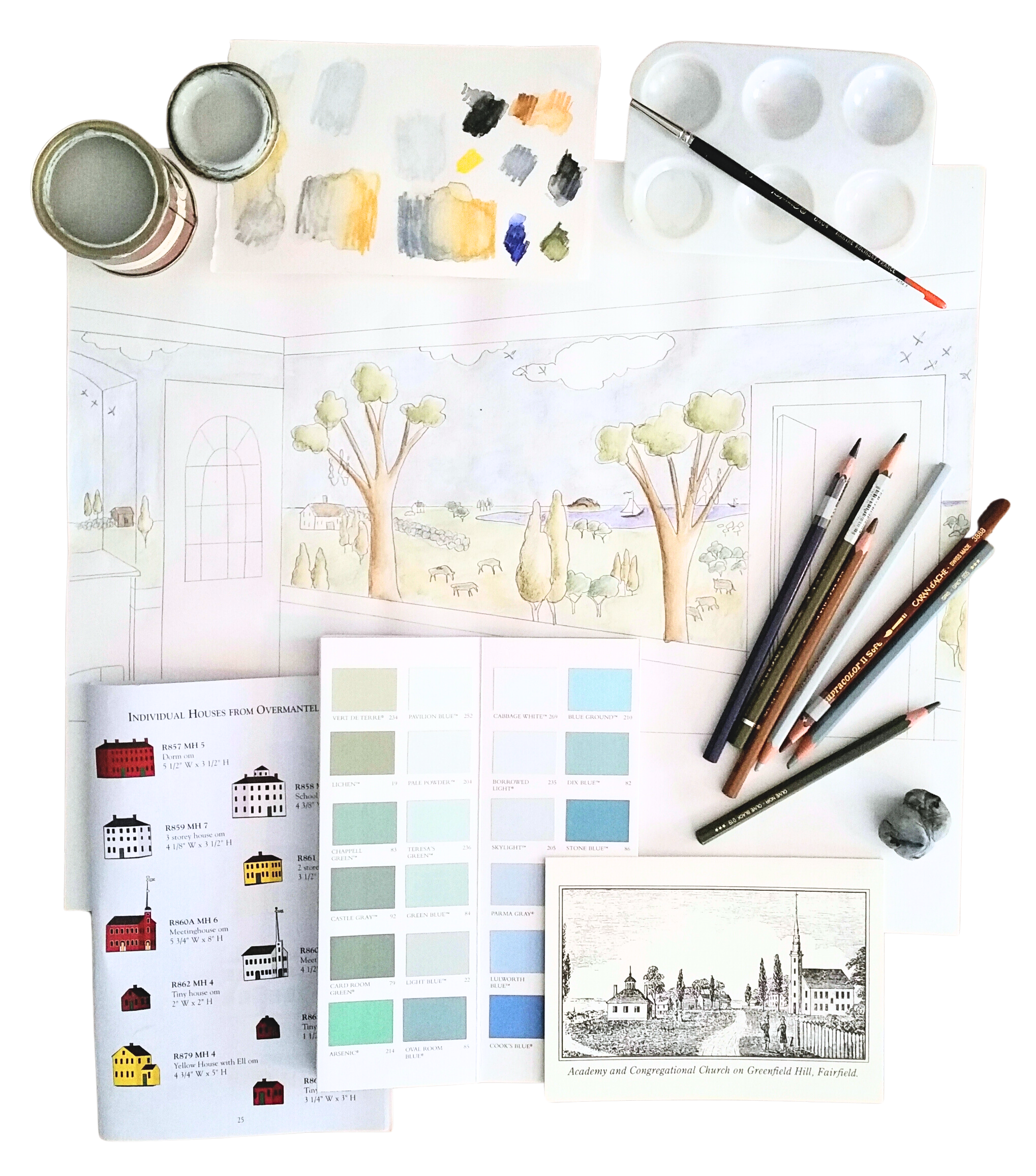 Art supplies including pencils, paintbrush, paint cans, color swatches, and sketches of landscapes and buildings on paper.